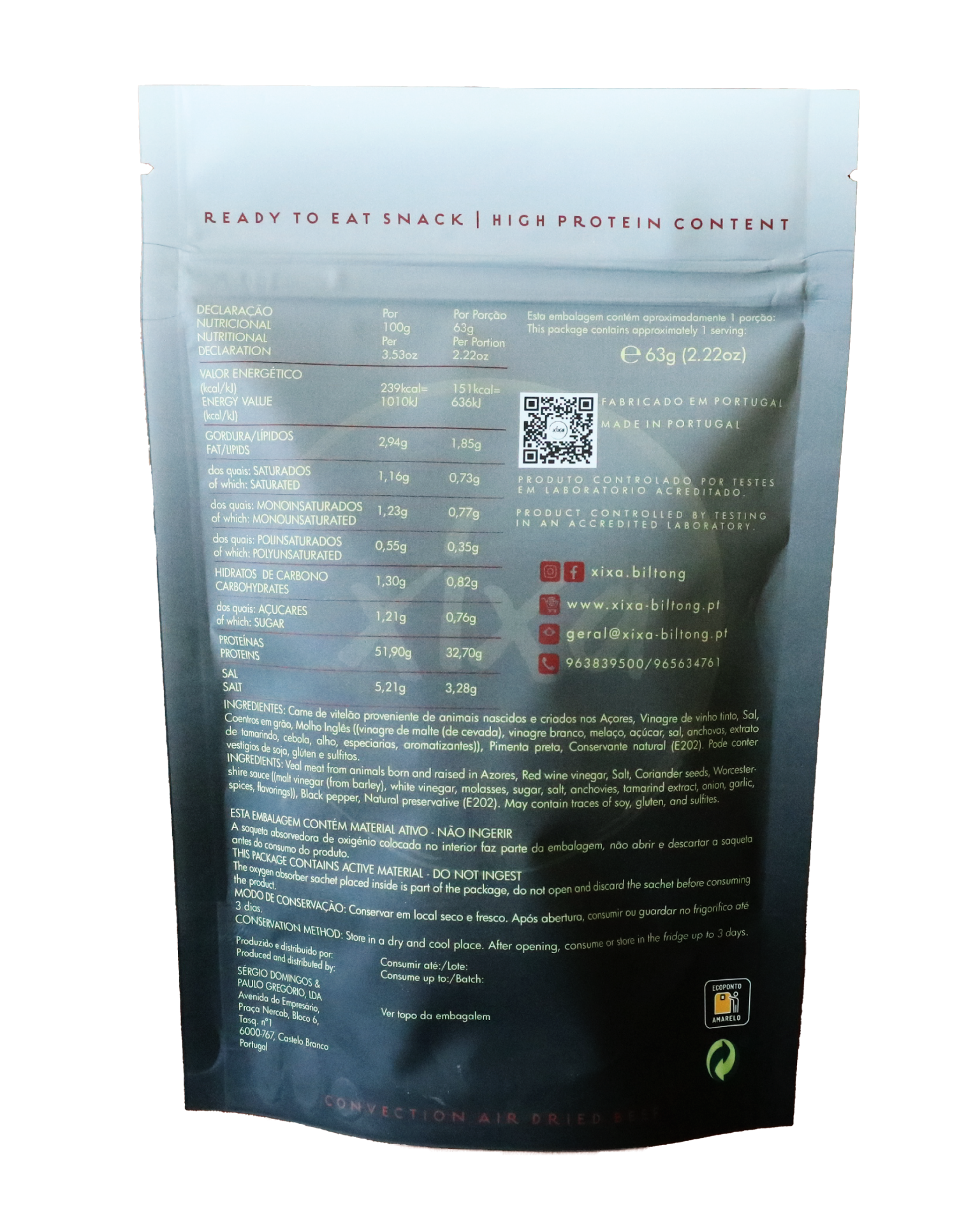 Carne de vitelão proveniente de animais nascidos e criados nos Açores, Vinagre de vinho tinto, Sal, Coentros em grão, Molho Inglês ((vinagre de malte (de cevada), vinagre branco, melaço, açúcar, sal, anchovas, extrato de tamarindo, cebola, alho, especiarias, aromatizantes)), Pimenta preta, Conservante natural (E202). Pode conter vestígios de soja, glúten e sulfitos.